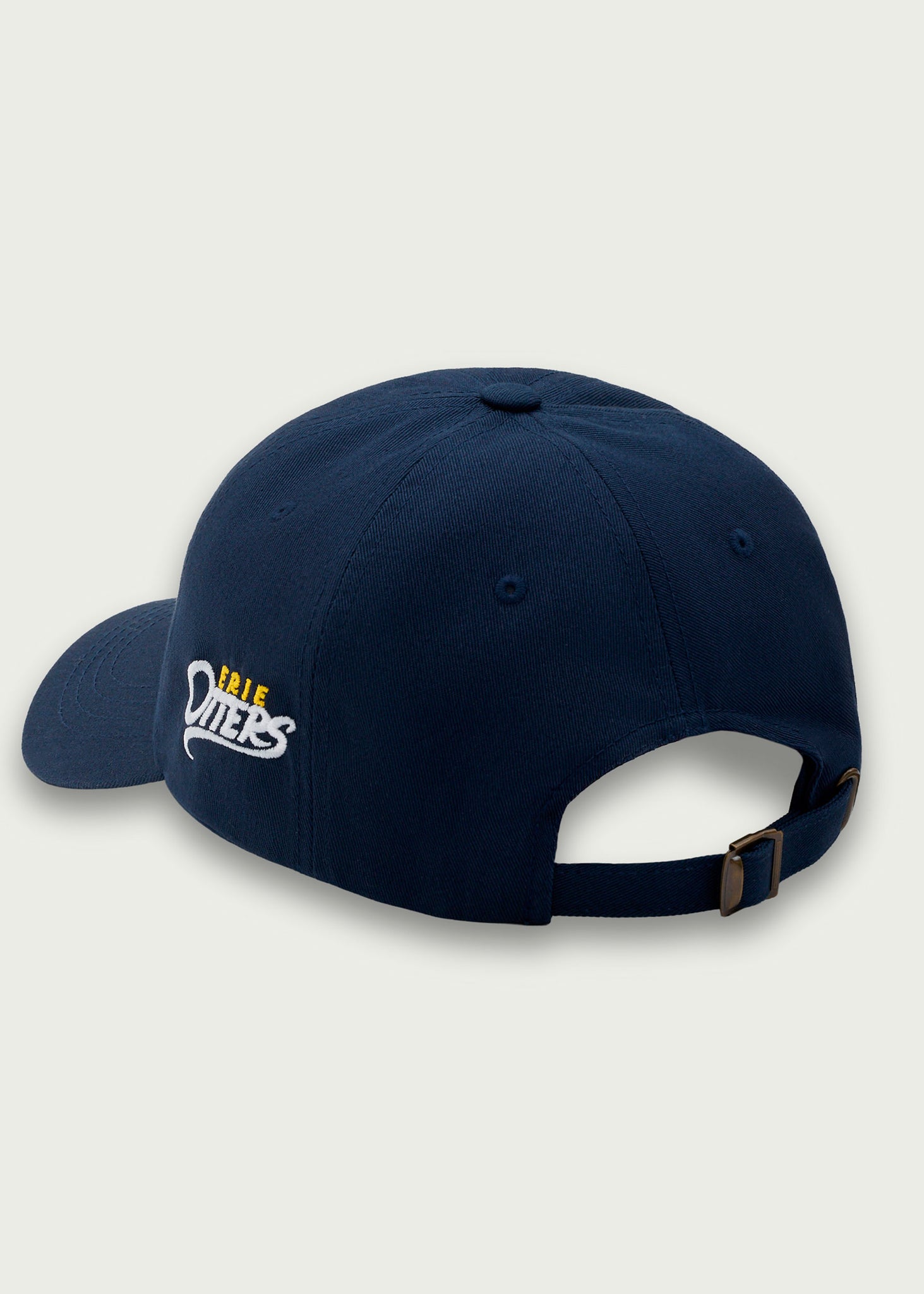 Navy adjustable hat with Erie's area code on the front and Otters script logo on the left side. Made locally at Erie Apparel.