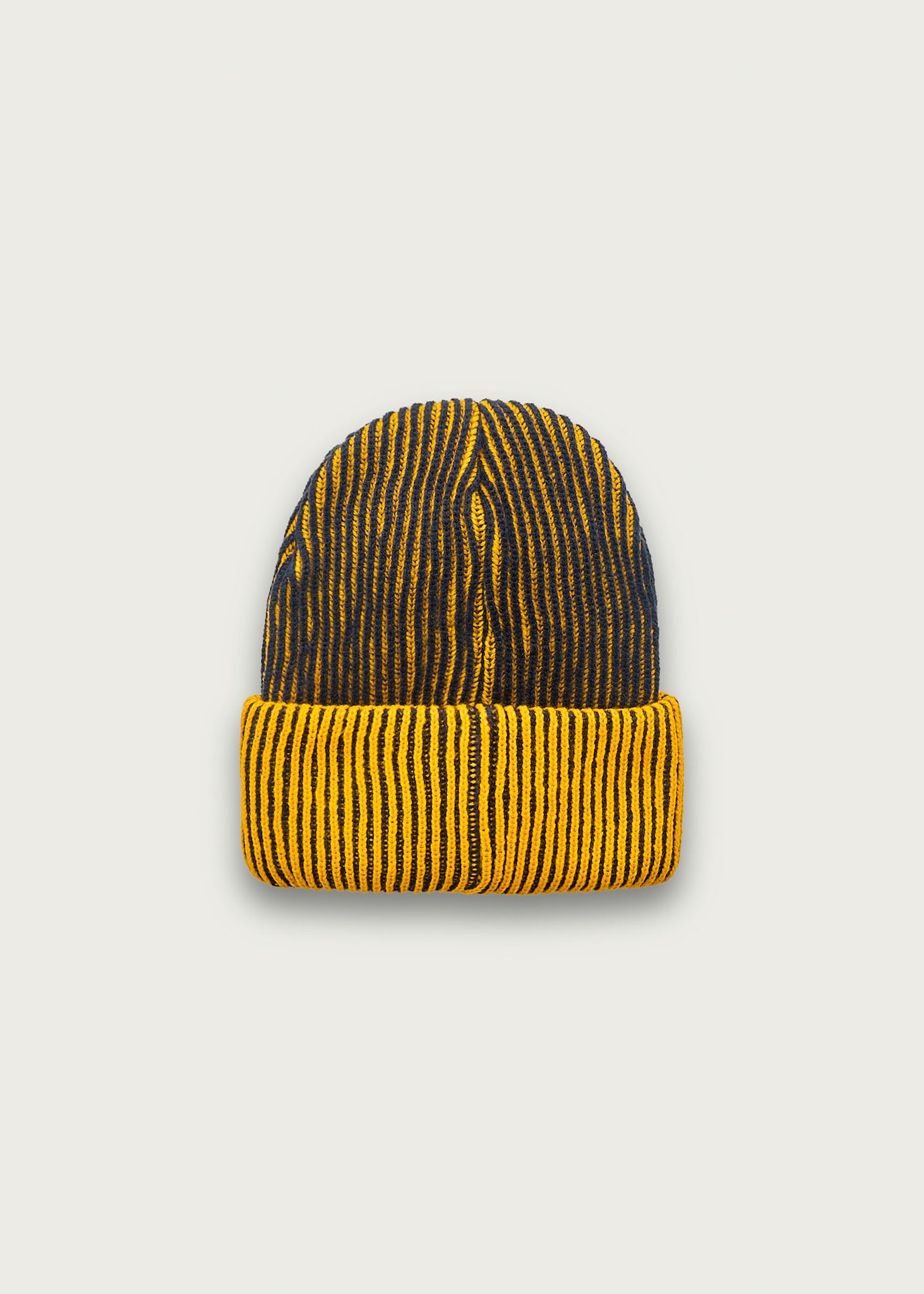 Navy and gold knit beanie with embroidered logo.