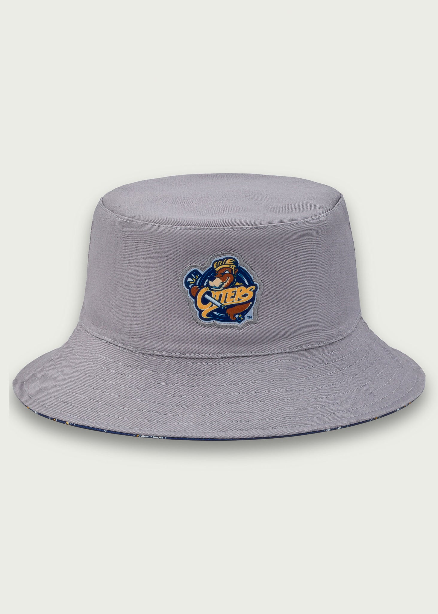 Grey with primary logo patch on one side and blue with keystone logos on the other.
