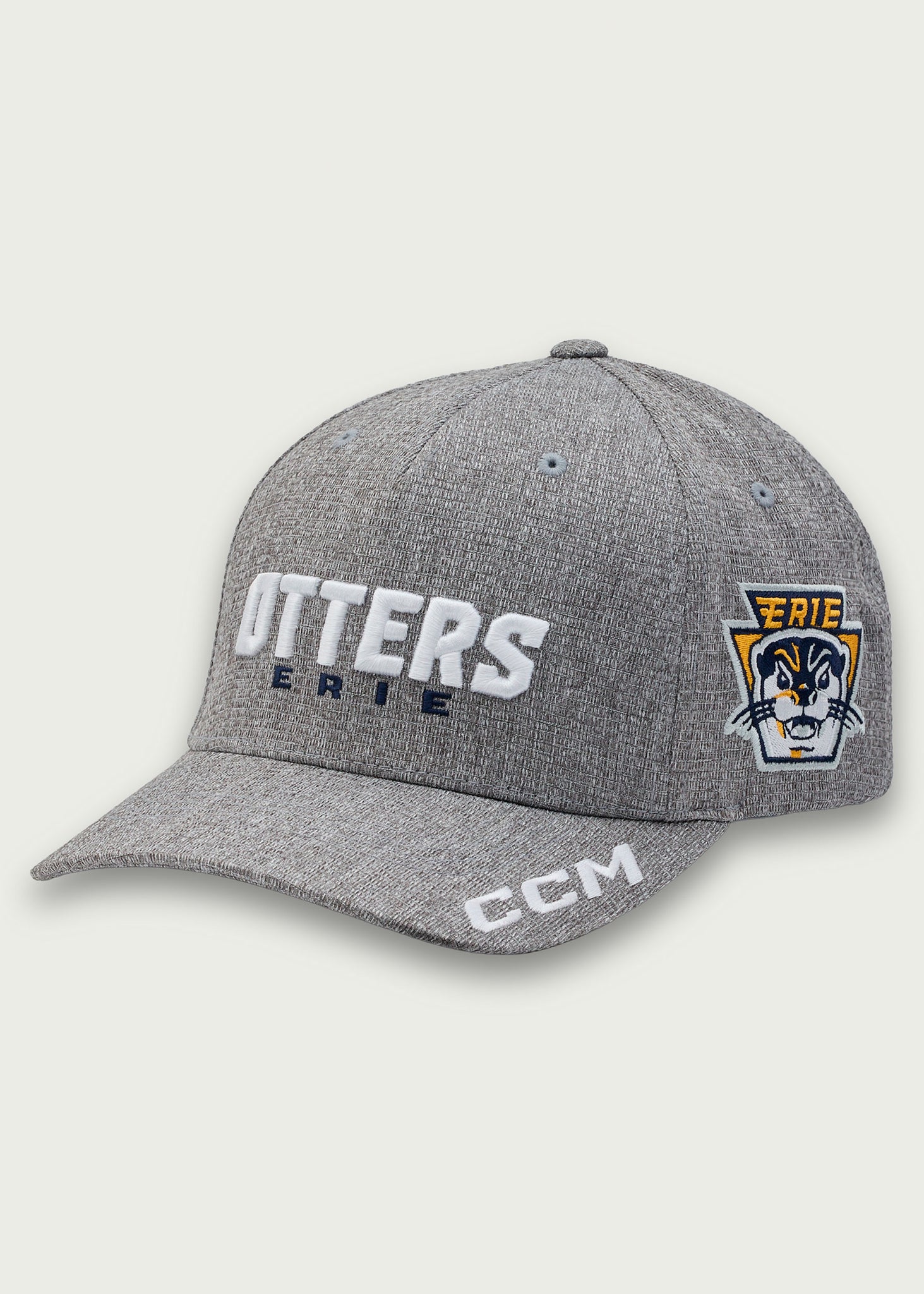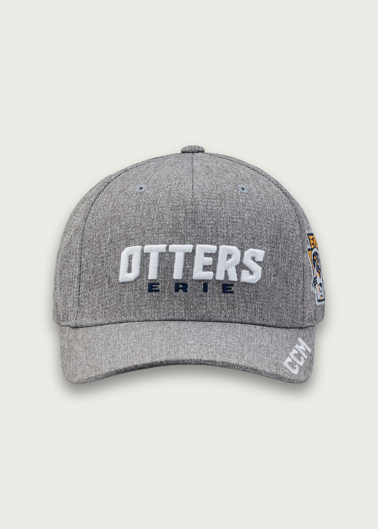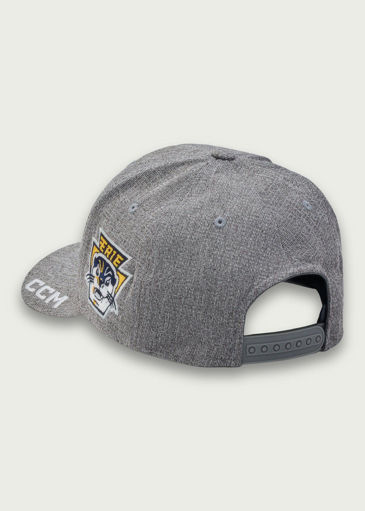 Grey, structured, adjustable hat.