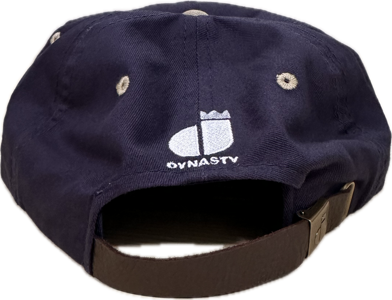 Navy and stone colored hat with leather adjustable strap.