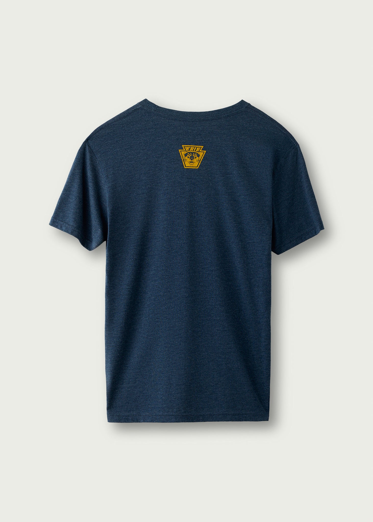Navy t-shirt with Erie's area code and the Otters keystone logo on the back. 50% polyester, 25% cotton, 25% rayon.