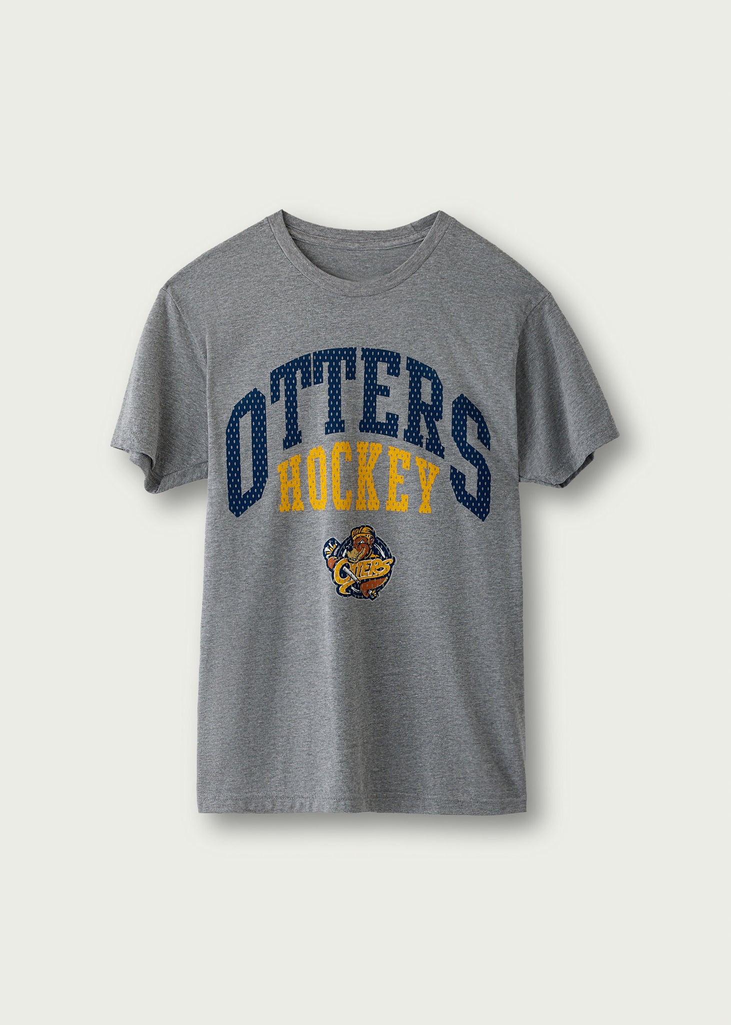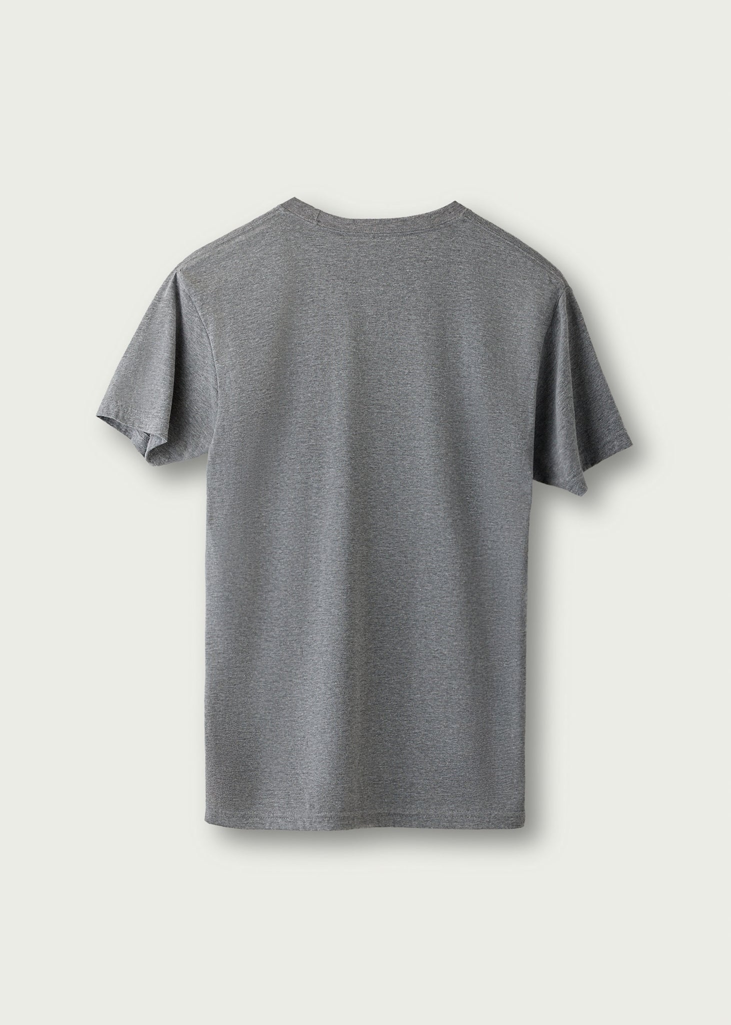 Grey, short sleeved t-shirt. 50% polyester, 25% cotton, 25% rayon.