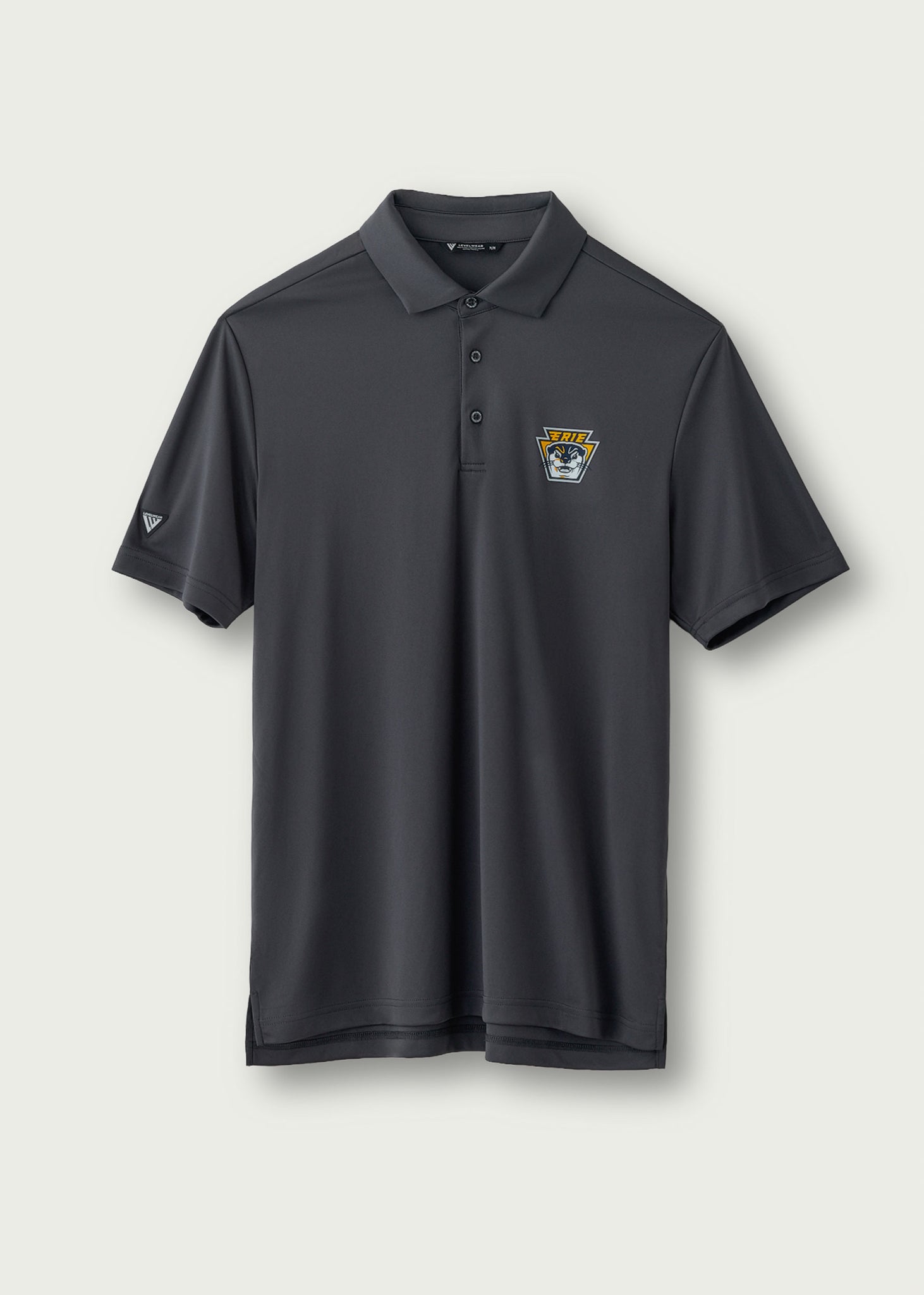 Dark grey polo. 100% polyester.