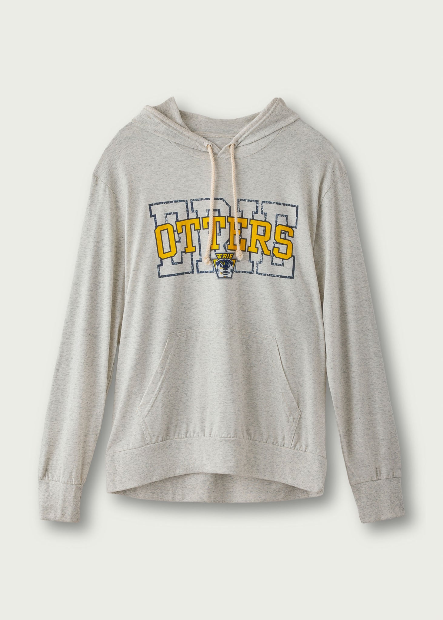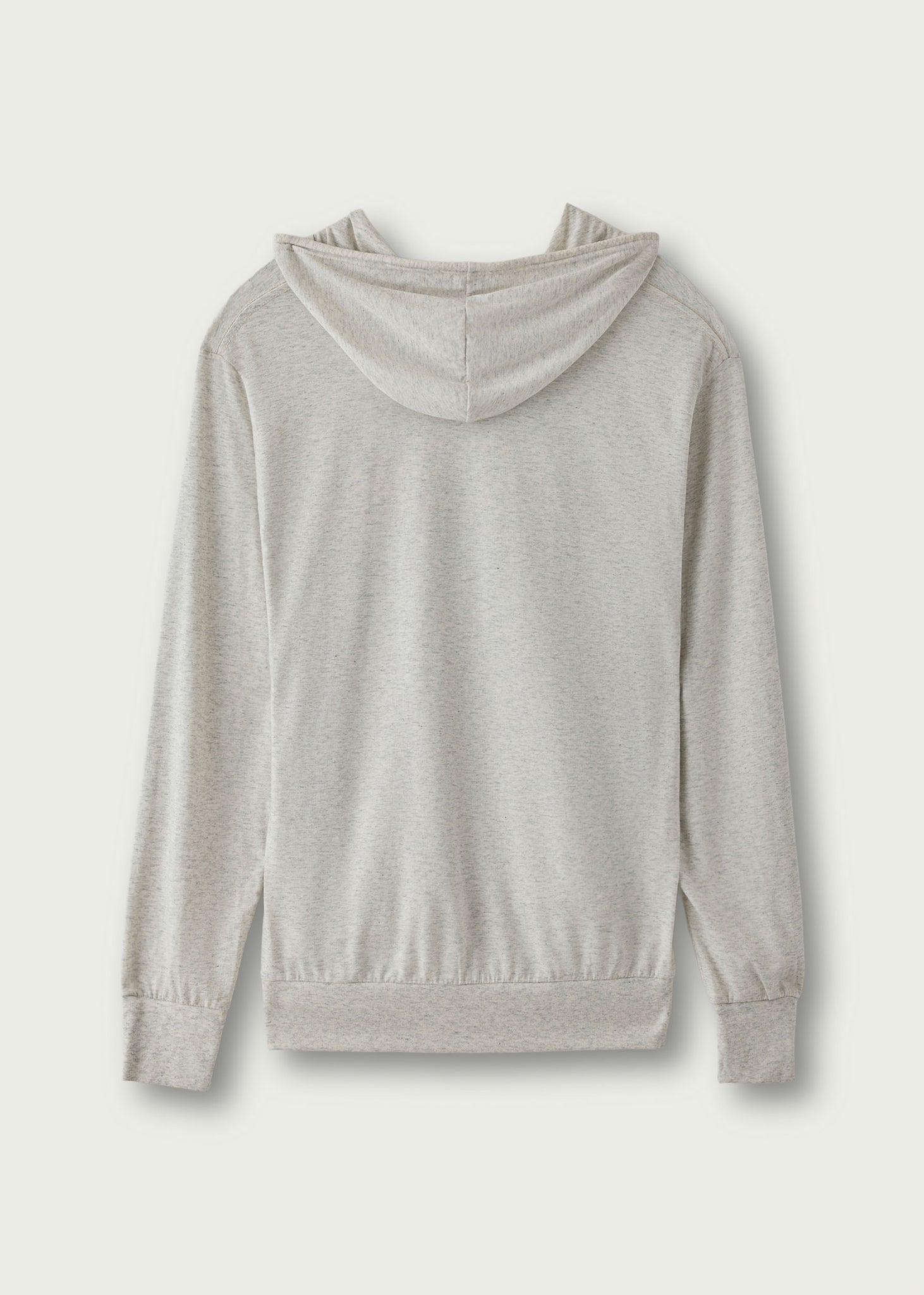 Light grey, light weight, long sleeve hooded t-shirt. 50% polyester, 37% cotton, 13% rayon.