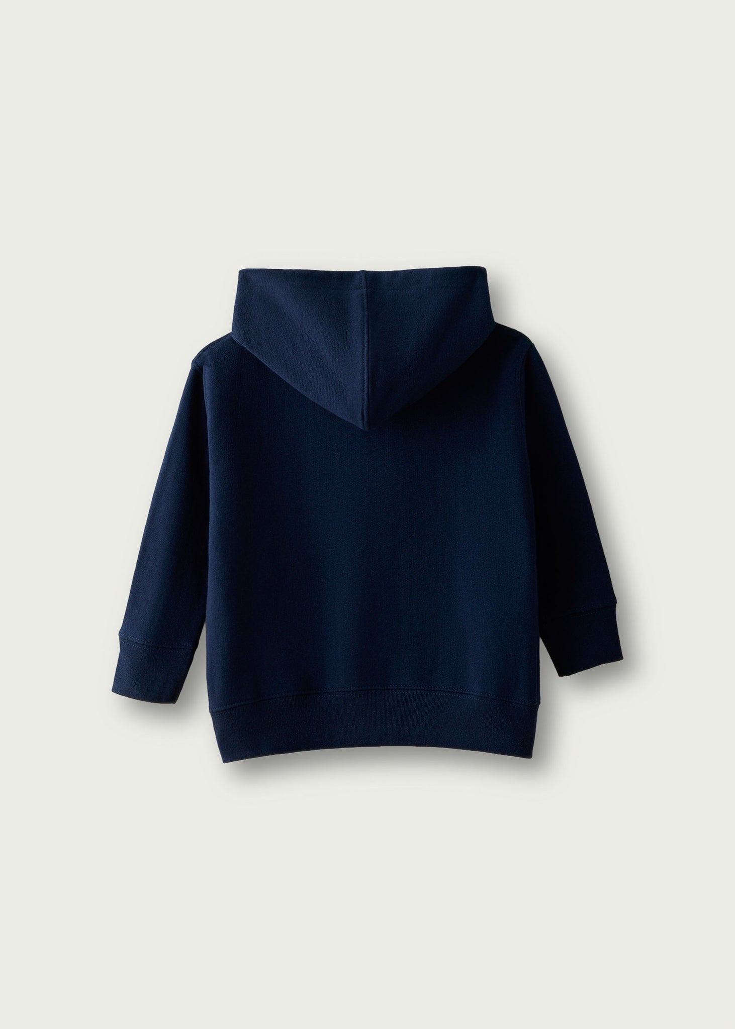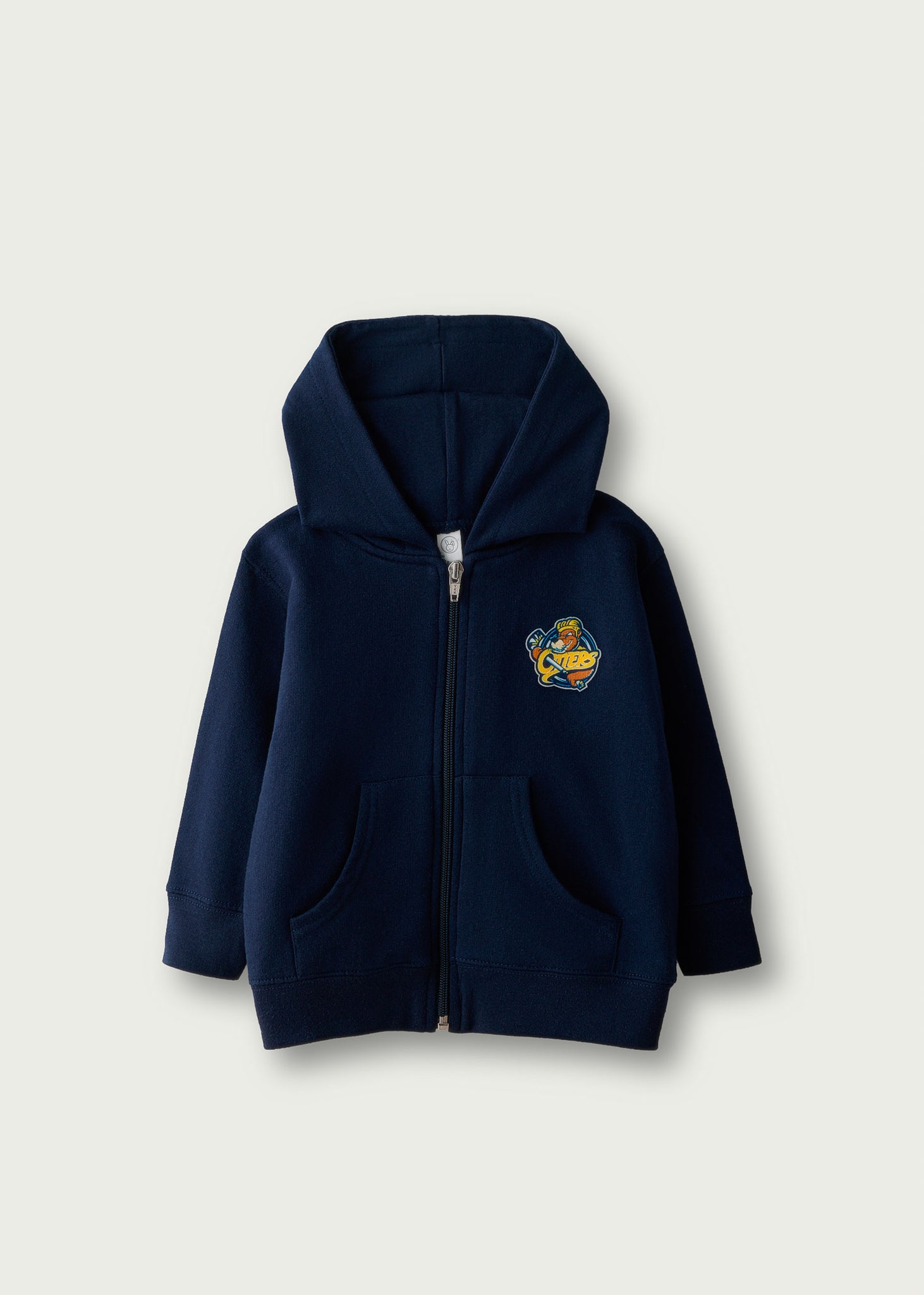 Navy full-zip hooded sweatshirt with screen printed logo on the left chest. 60% cotton, 40% polyester.
