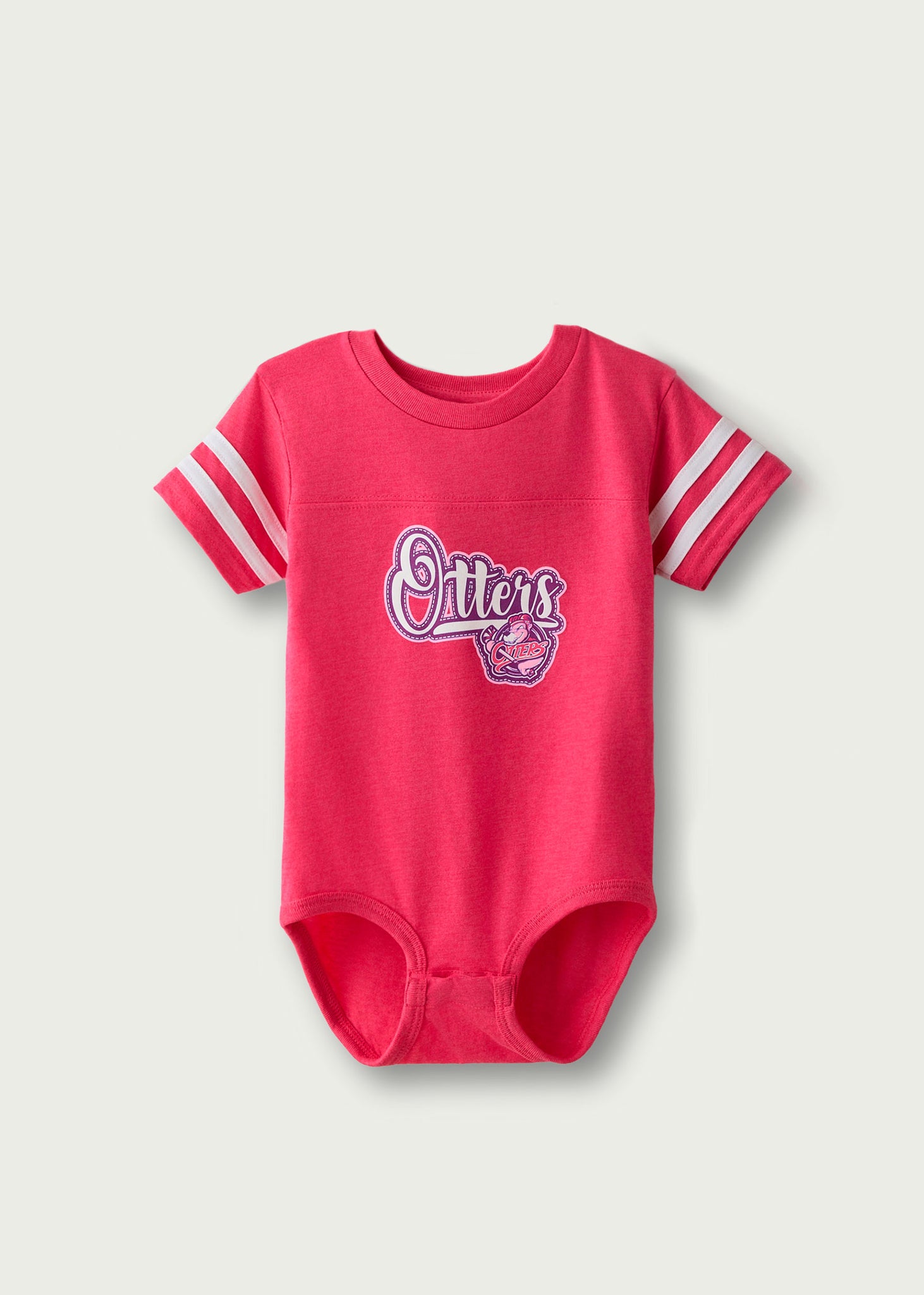 Pink short sleeve onesie. 60% cotton, 40% polyester.